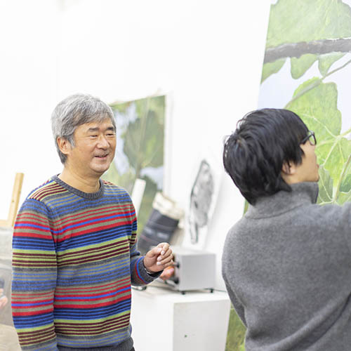 西洋と日本の美術史や、現代社会の問題について、グループで学習します。そのうえで、美術史の延長線上にある自分、現代社会の一部である自分を意識しながら作品を制作。広い視点をもって「今、何を描くべきか」を考え続ける姿勢を身につけます。