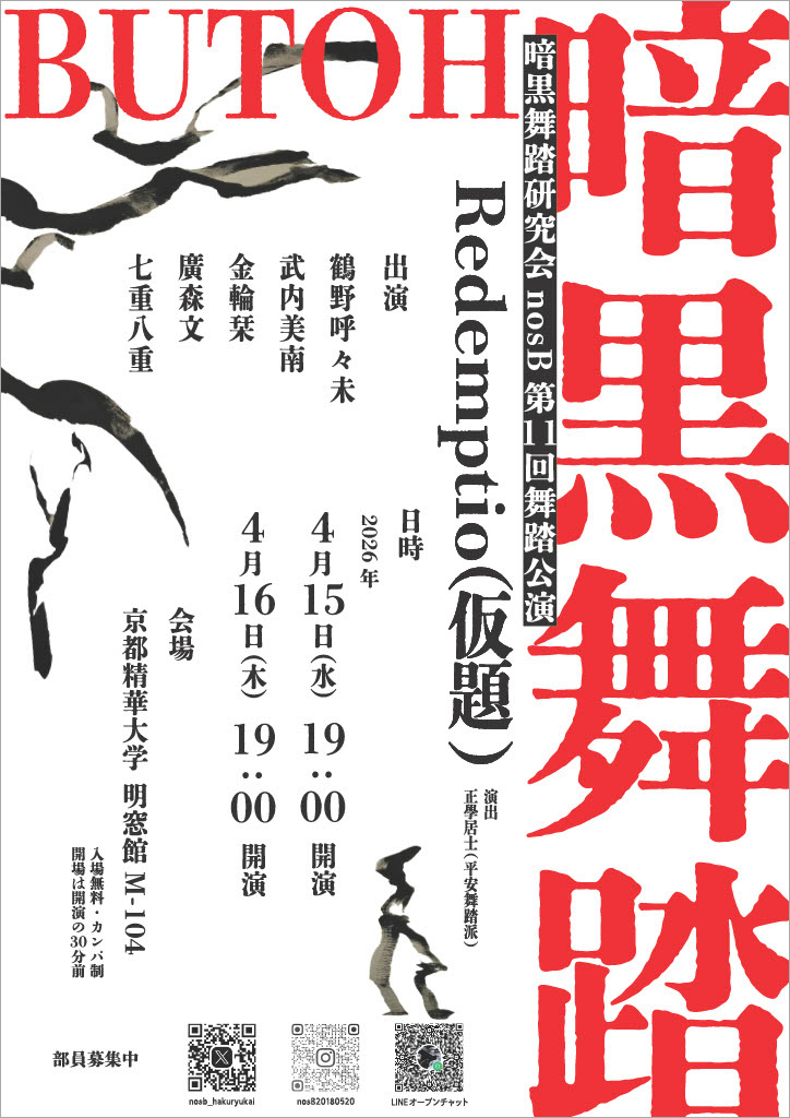 暗黒舞踏研究会nosBは、京都精華大学名誉教授であり、とりふね舞踏舎主宰の三上賀代氏に師事し、2018年に結成。京都精華大学を拠点に、暗黒舞踏を軸とした独自の表現を追求している団体です。ぜひご鑑賞ください。