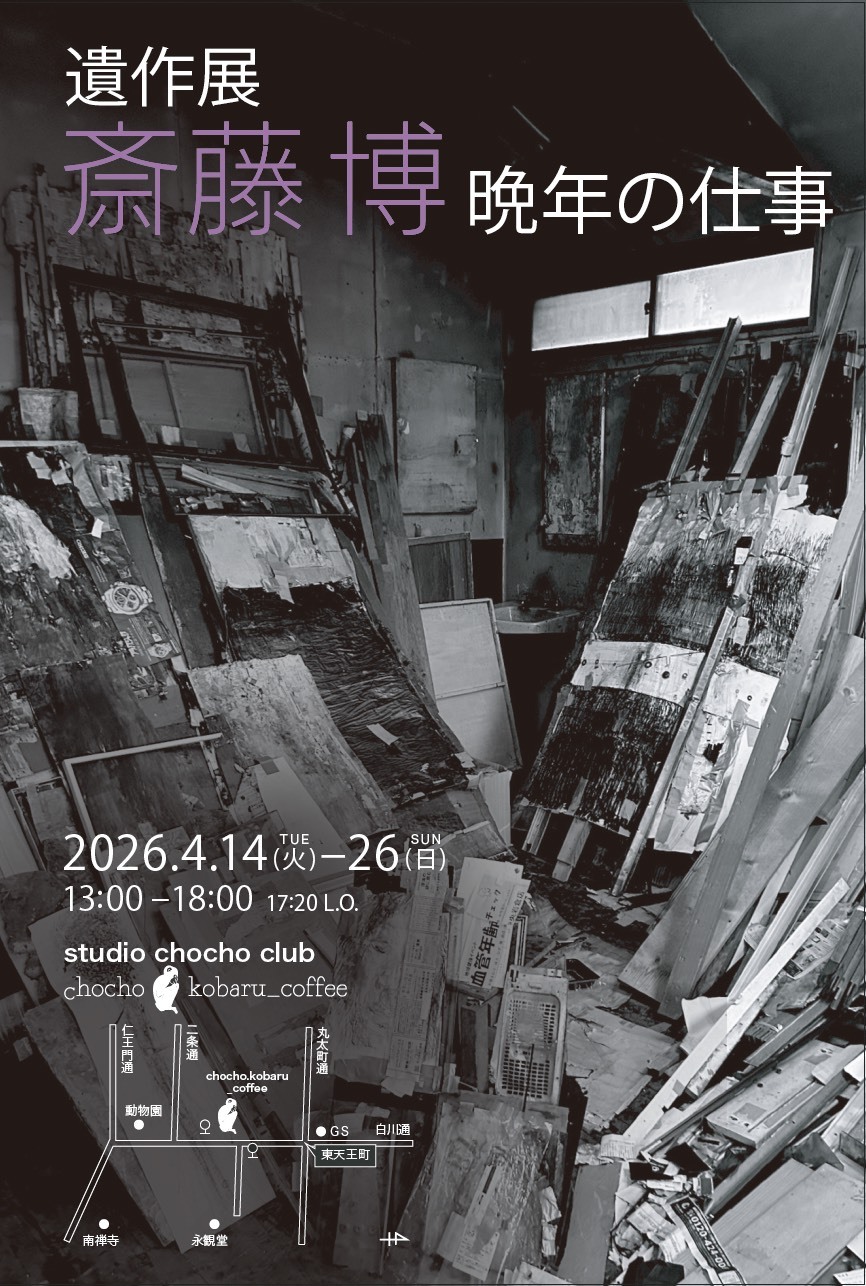 本学元学長で名誉教授の斎藤 博の「遺作展|斎藤博 晩年の仕事」が、京都市左京区にあるstudio chocho clubにて開催されます。本展は、本学名誉教授の佐川晃司が企画し、同じく本学名誉教授の生駒泰充と芸術研究科修了生の田中真吾さんが協力する遺作展です。ぜひ会場へお越しください。