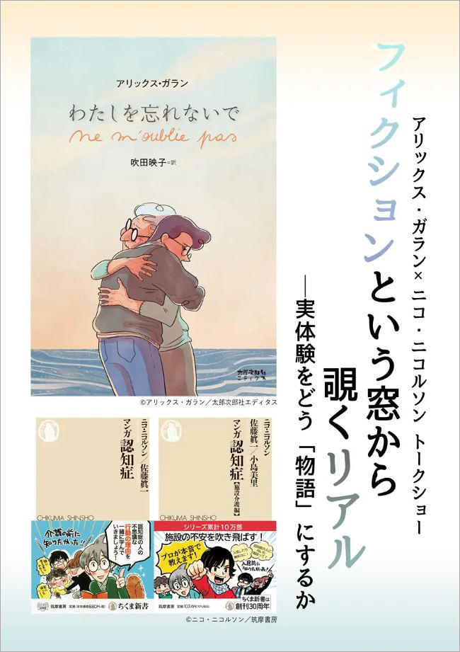 アリックス・ガラン氏の「わたしを忘れないで」(太郎次郎社エディタス)と、ニコ・ニコルソン氏の「マンガ認知症」(筑摩書房)は、一方は自伝的エッセイとして、もう一方はフィクションとして、どちらも認知症の祖母と過ごした実体験をもとに物語が描かれています。現実と創作の間で、記憶や感情をどうマンガとして表現するのか。フランスと日本の国境を越えた、ふたりの作家が語り合います。司会は京都精華大学国際マンガ研究センターの研究員で、本学人文学部教員のユー・スギョンが務めます。ぜひご参加ください。
