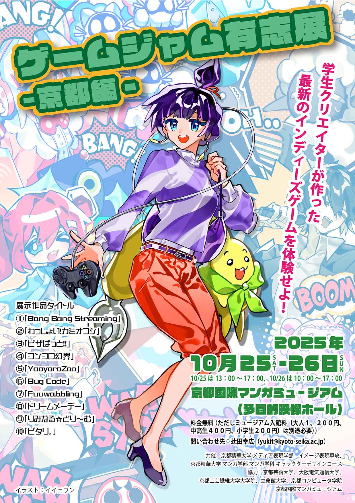 本イベントは、京都精華大学のマンガ学部キャラクターデザインコースとメディア表現学部イメージ表現専攻が共催し、複数の大学の学生たちが協力して制作したゲーム作品を展示し、実際にゲームをプレイすることができるイベントです。