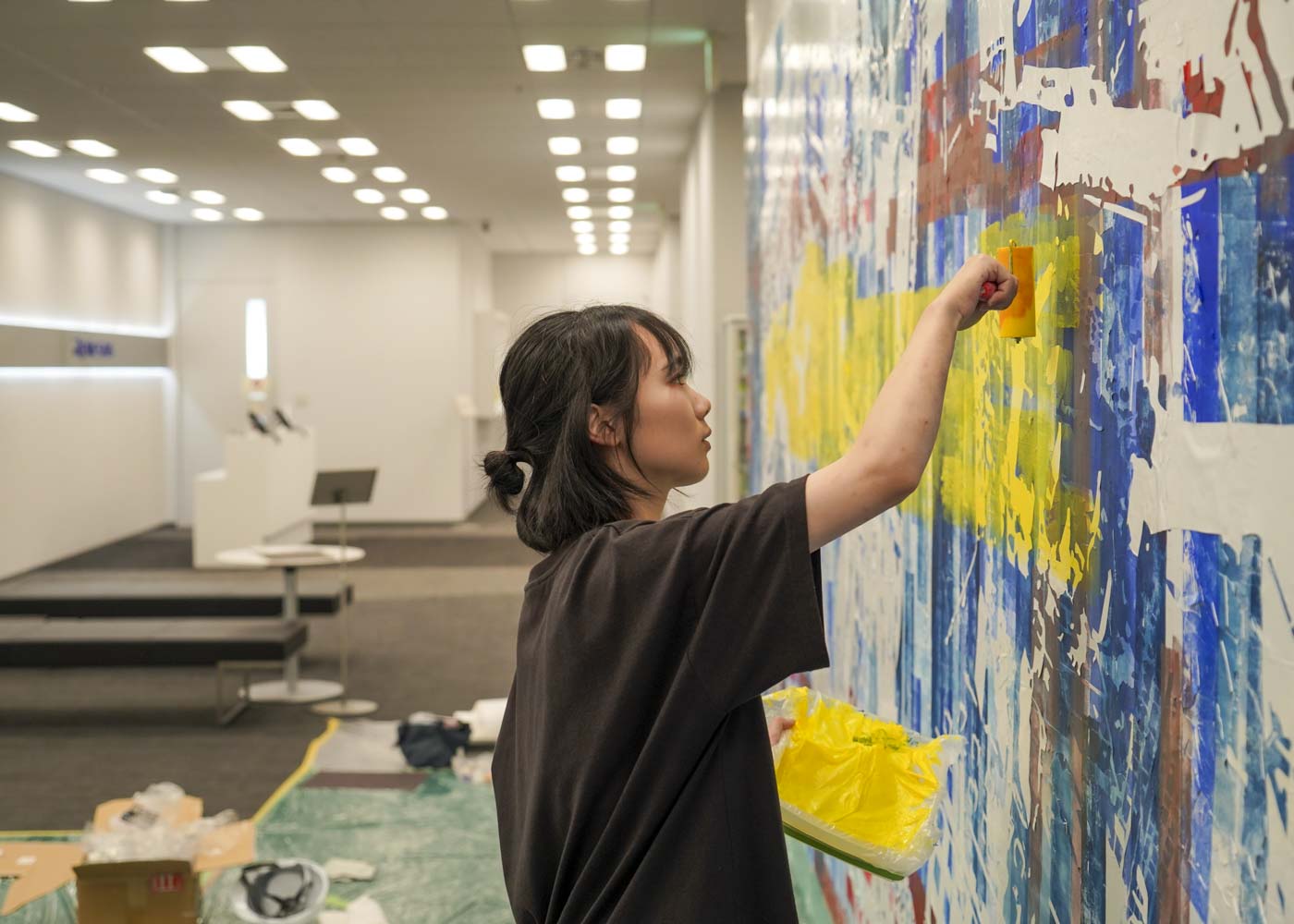 本プロジェクトは、ルネサス エレクトロニクス株式会社(以下、ルネサス)が発足されてから2025年で15周年となる節目に実施されたもので、グローバルに挑戦し続けるルネサスと、未来に向かって表現を磨き続ける美術系大学に通う学生らの思いを重ね、学生がアーティストとして飛躍するきっかけになることを願って立ち上げられました。ルネサスは、学生アーティストを対象に「Renesas × Rising Artist Program」と称した公募を実施。全国16校から32名の応募があり、厳選なる審査を通過した2名が制作者に選出され、本社である豊洲オフィス(東京都江東区)と武蔵事業所(東京都小平市)の各オフィスで壁画サイズのアート制作に取り組むこととなりました。