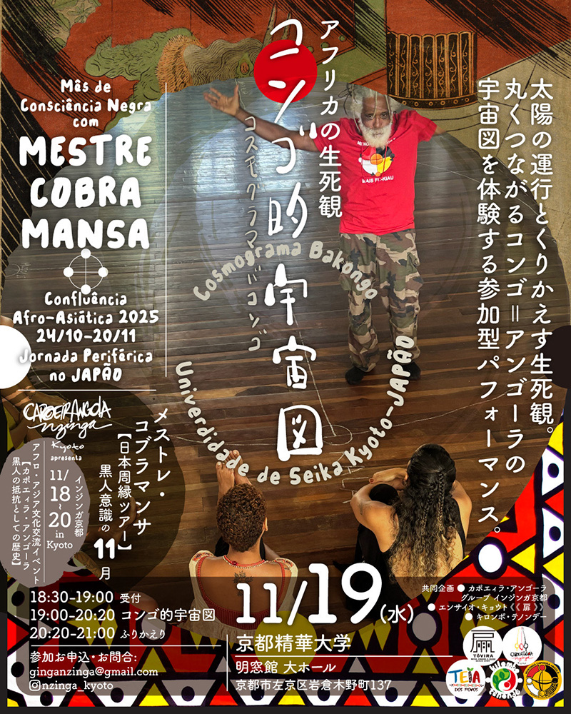 このイベントは、カポエィラ・アンゴーラ グループ インジンガ京都支部が企画する、アフロ・アジア文化交流イベント「黒人意識の日・ズンビの日を通して考える「カポエィラ・アンゴーラ 〜 黒人の抵抗としての歴史」」のひとつとして実施される体験型ワークショップです。カポエィラ・アンゴーラとは、奴隷制度下のブラジルでアフリカ系の人々がルーツを保つために生み出した、踊りや格闘技、音楽が融合した伝統芸能です。11月18日から20日の3日間、師範であるメストレ・コブラマンサ氏を京都にお招きし、座談会や講義、ワークショップなどが各所で実施されます。