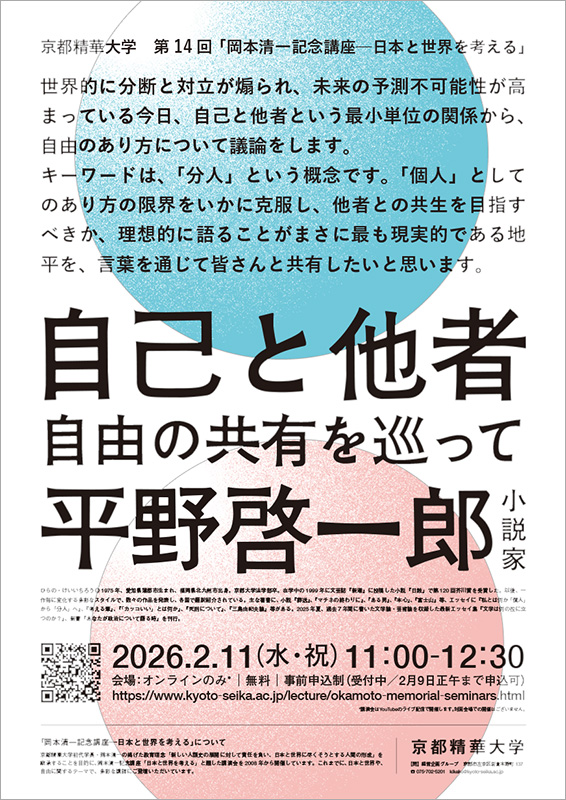 「岡本清一記念講座─日本と世界を考える」は、京都精華大学の初代学長である岡本清一の掲げた建学の理念を受け継ぎ、広く周知するために開設した講座。本学の教育理念「新しい人類史の展開に対して責任を負い、日本と世界に尽くそうとする人間の形成」を検証し、継承することを目的として開催しています。